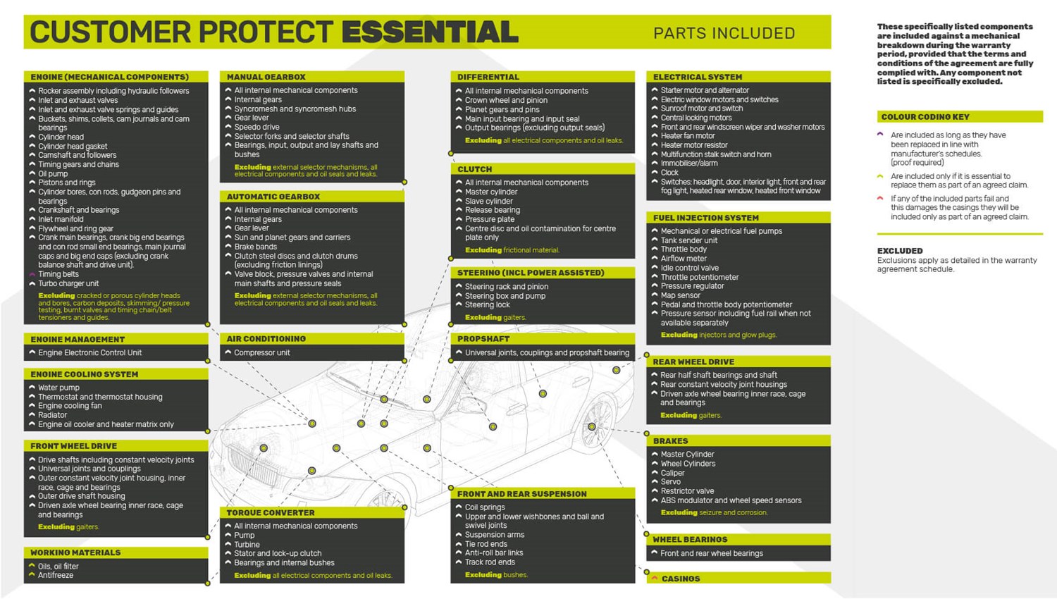 If your vehicle goes wrong it's inconvenient, aggravating and potentially costly. The Customer Protect Essential Warranty helps to ease the stress and minimise the strain on your wallet.